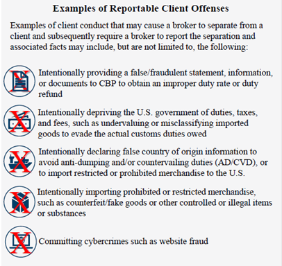 Significantly, whereas the broker cannot file any information with the U.S. Government which it knows to be false or misleading, the broker’s decision to separate from a client for business reasons not relating to a fraud on the U.S. Government do not have to be reported to CBP under the regulation.